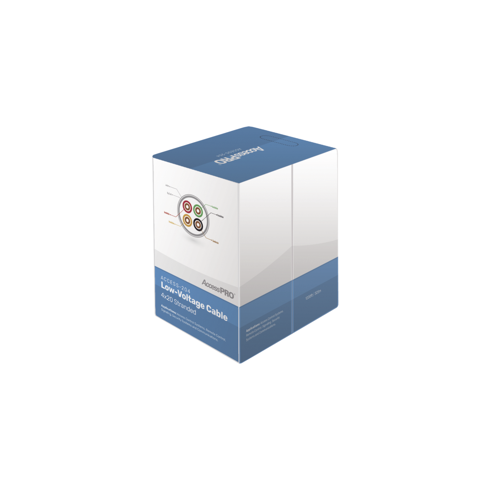 Bobina de 305 metros con 4 conductores de cobre trenzado calibre 20, aislamiento individual de FRPVC de alta calidad, cubierta exterior de PVC con protección anti-flama CM. Para aplicaciones de control de acceso