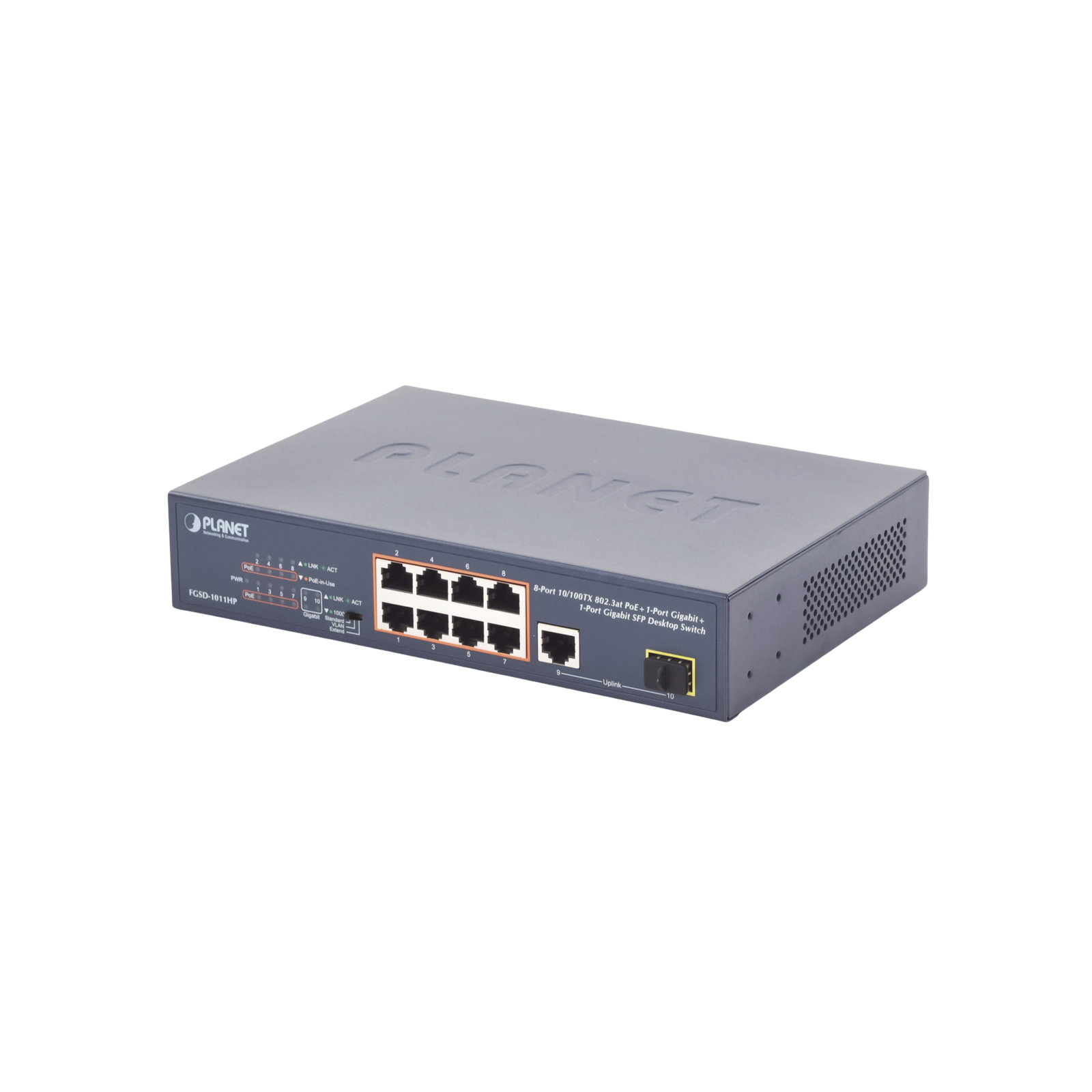 Switch no Administrable 8 puertos 10/100 PoE 802.3af/at 135W, 1 puerto Uplink 10/100/1000 y 1 SFP 100/1000 para escritorio